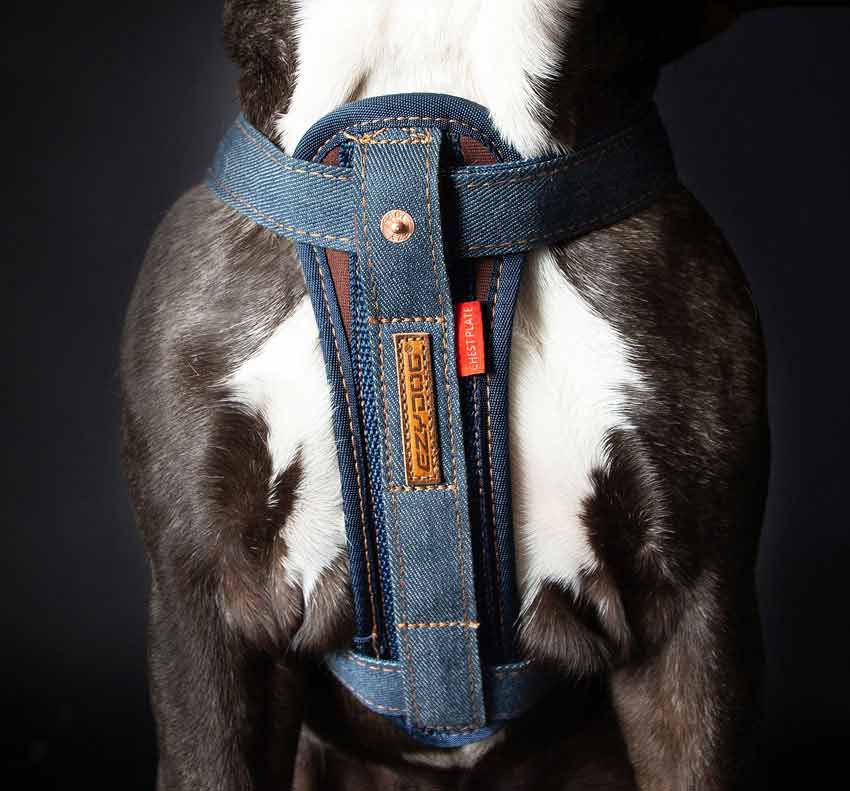 The Denim harness has all of the benefits of the standard EzyDog Chest Plate Harness but also includes, custom leather patches, jean studs, brass hardware and a high grade denim finish.