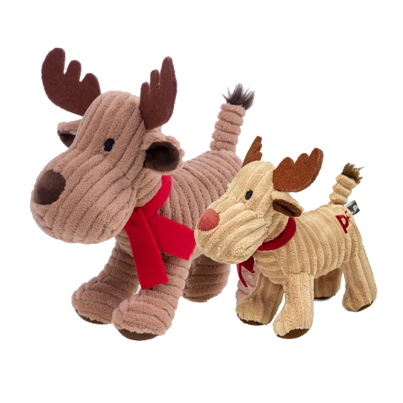 The group image of the two reindeer is not shown to scale. The sizes shown able are provided to give a better understanding of the size of each of the reindeer dog toy.